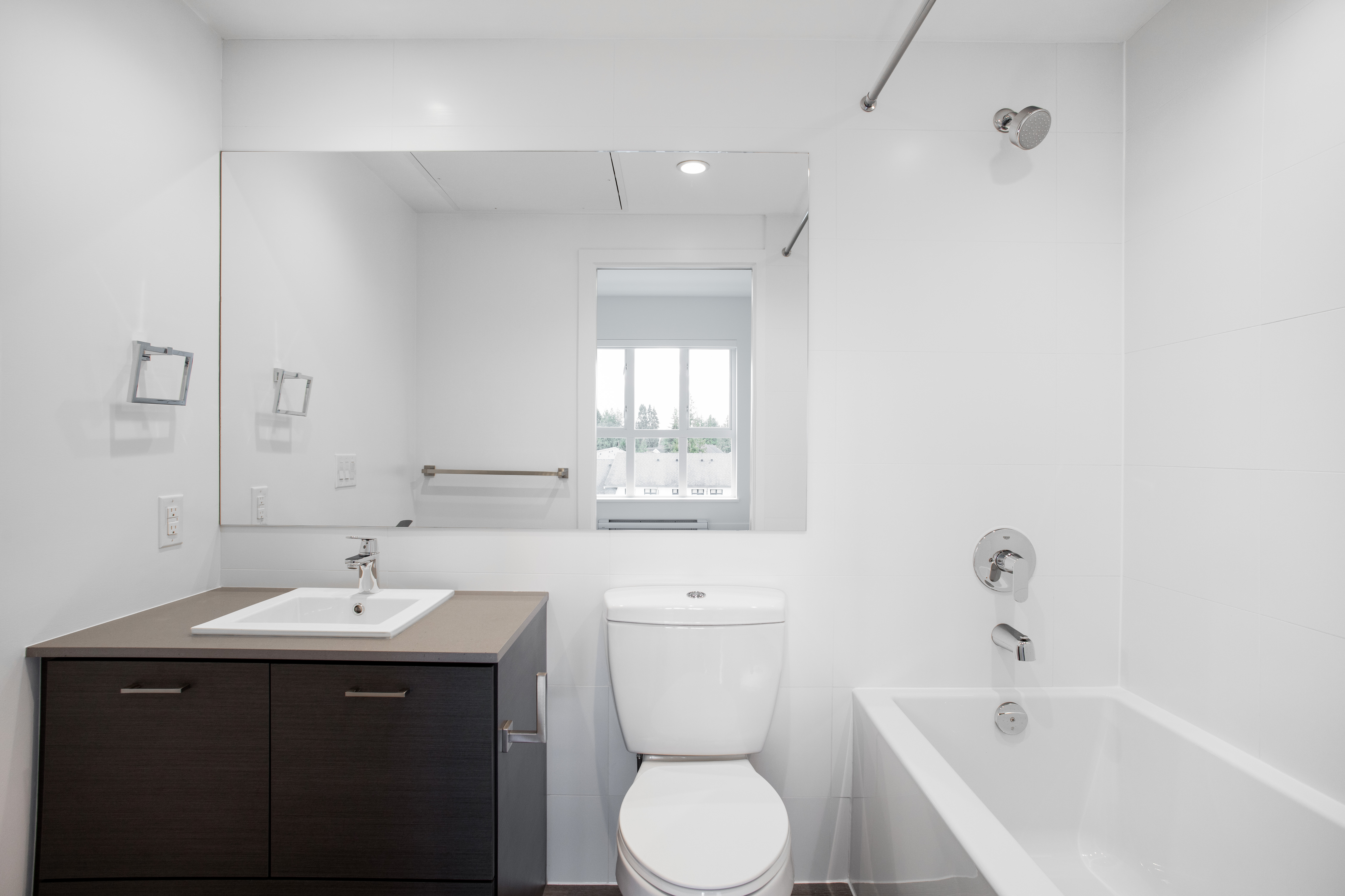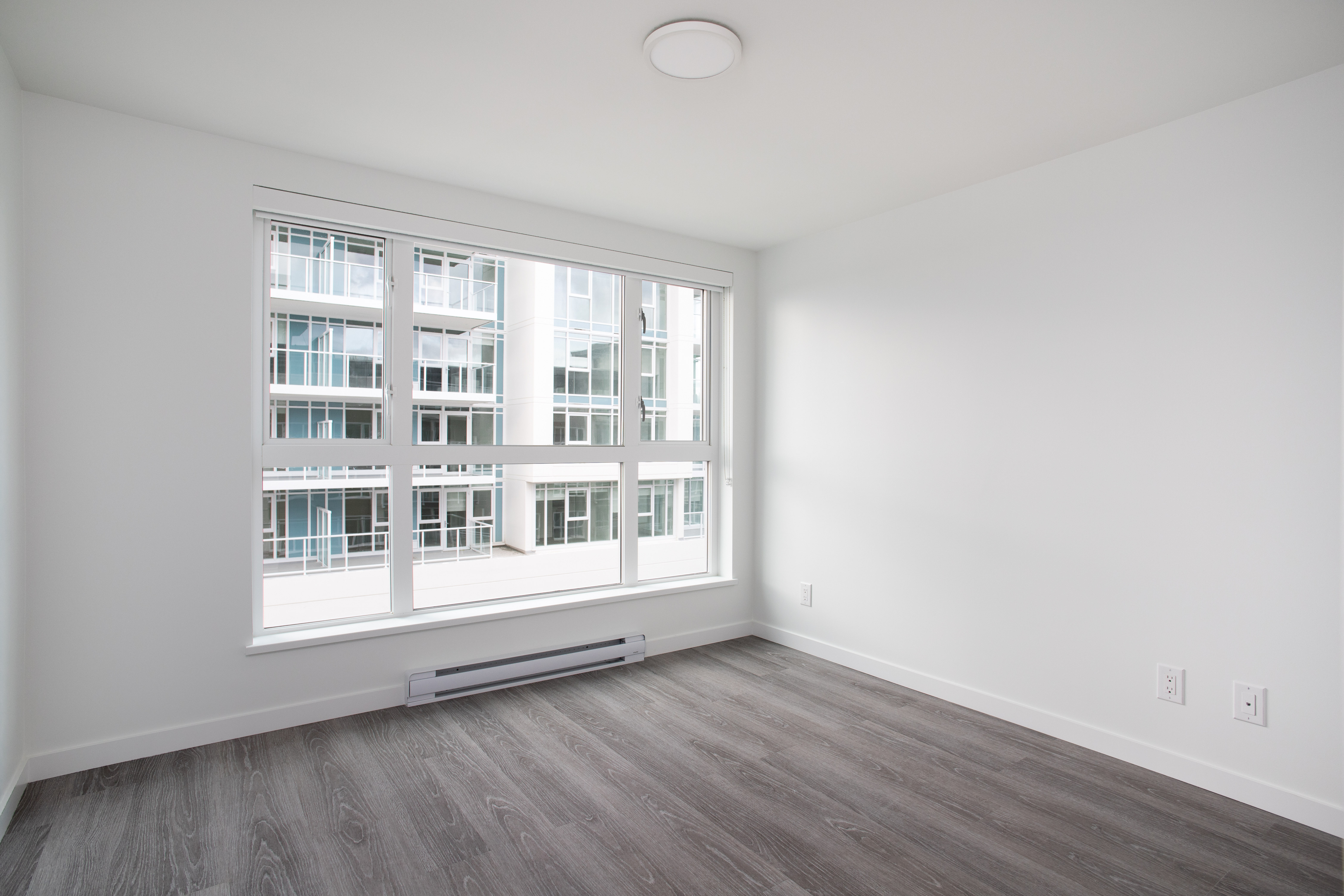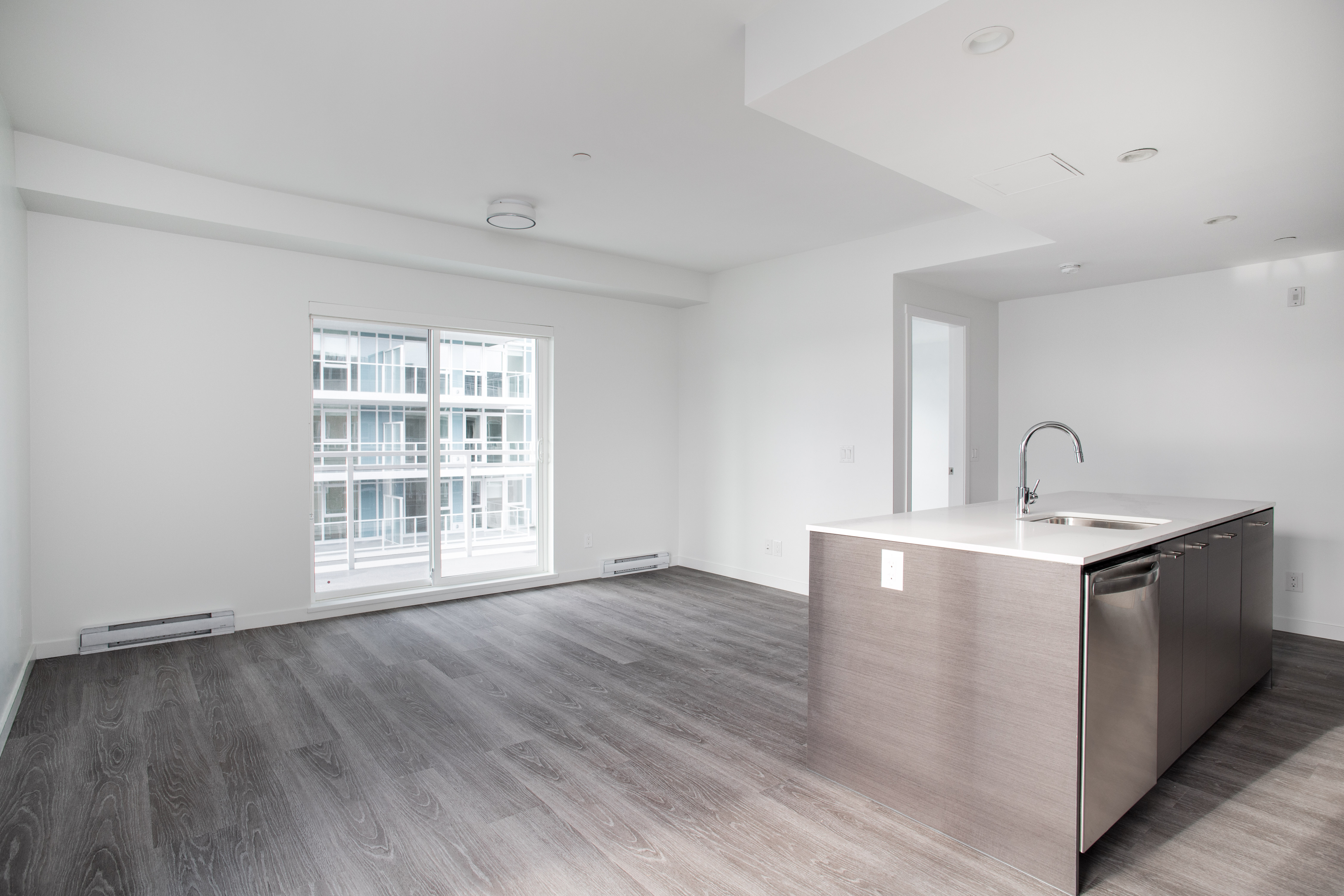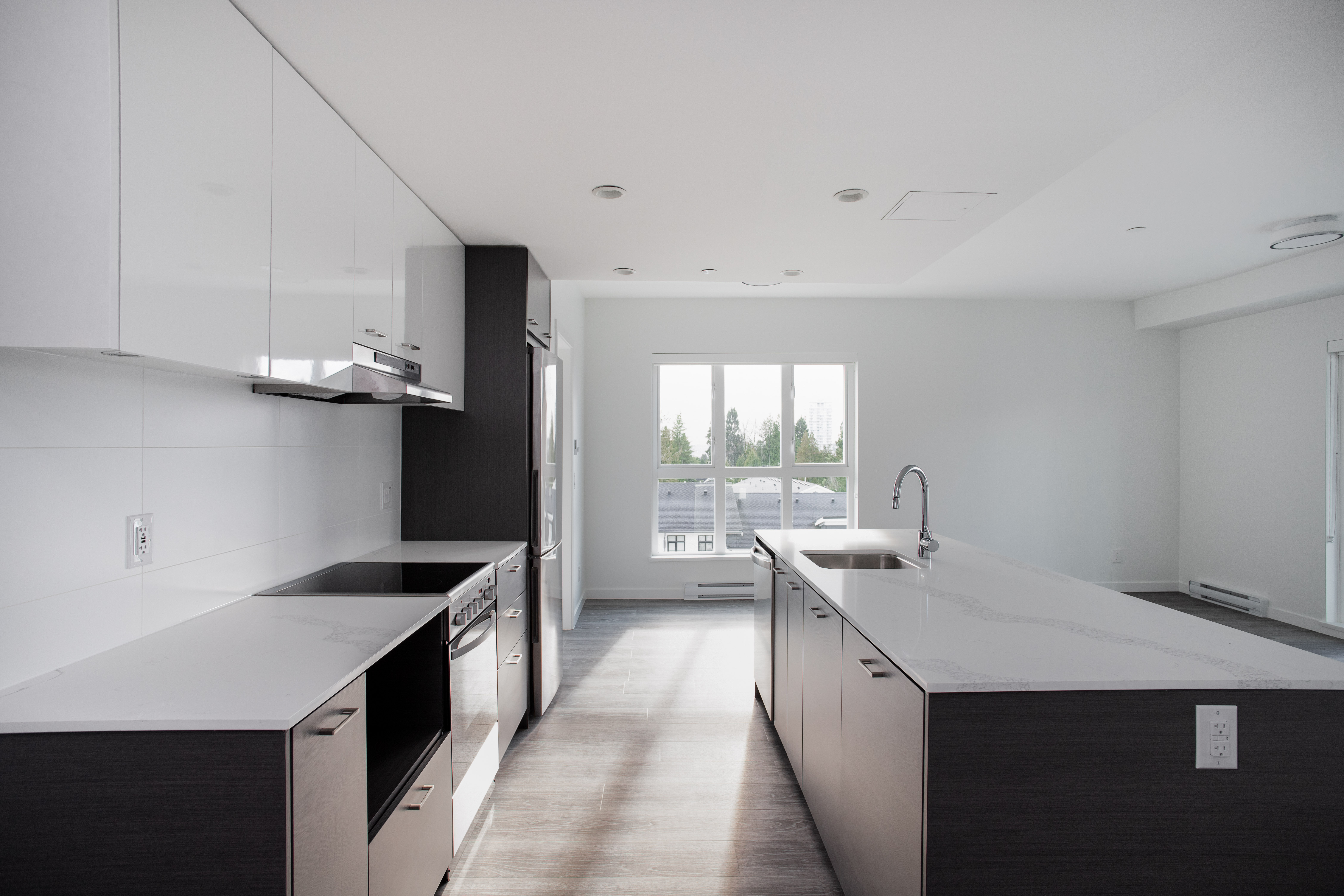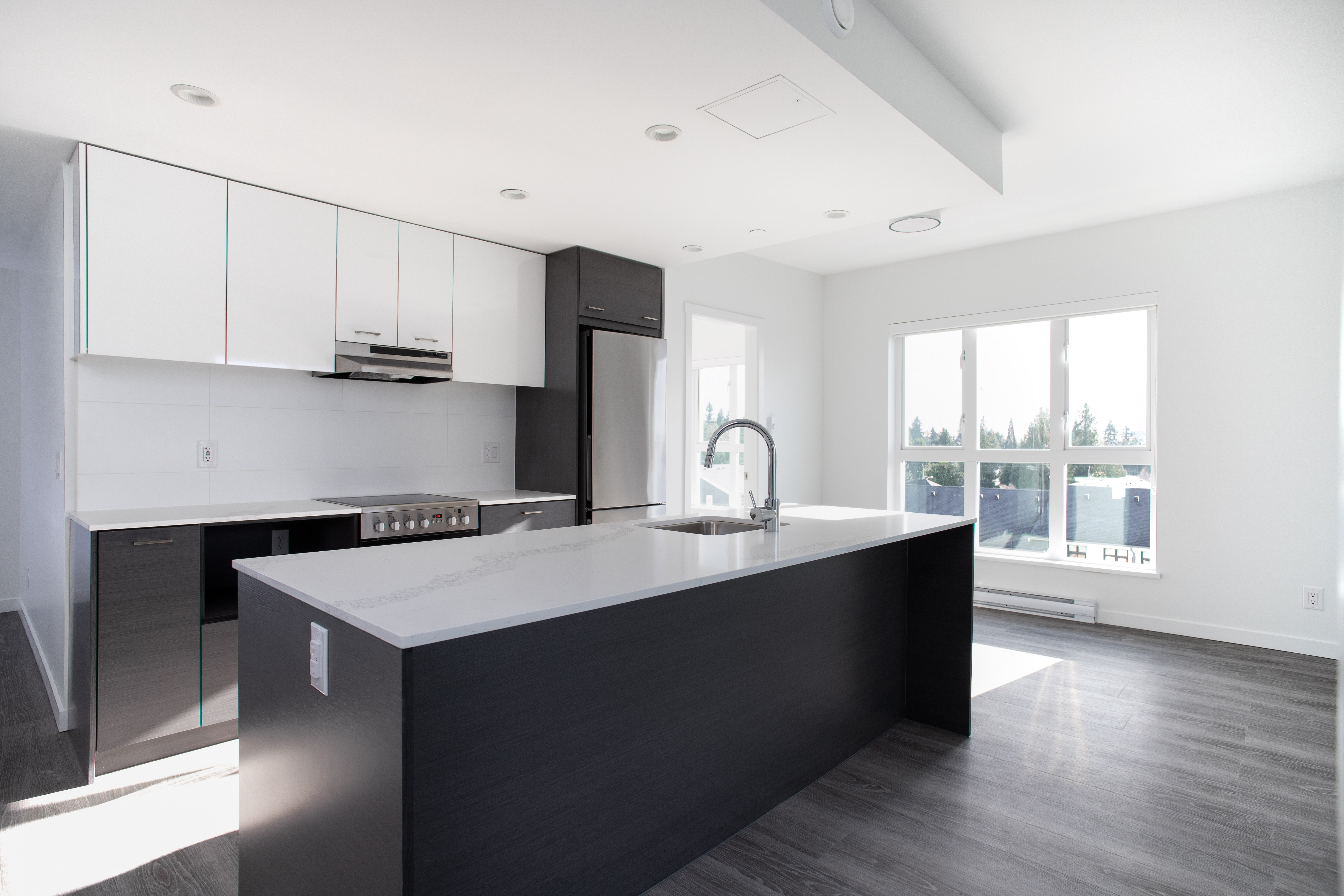Our largest 2-bedroom plan, the D4 plan sits at 840sqft. With an 8ft long kitchen island, you have copious amounts of prep space, all while doubling as a breakfast far. Fitted with low-energy appliances, LED lights and beautiful quartz counters, this kitchen is modern and sleek. The ideal space for roommates, or families as both rooms are on opposing sides and provide a great deal of privacy. This corner suite offers large windows and natural light all year round.