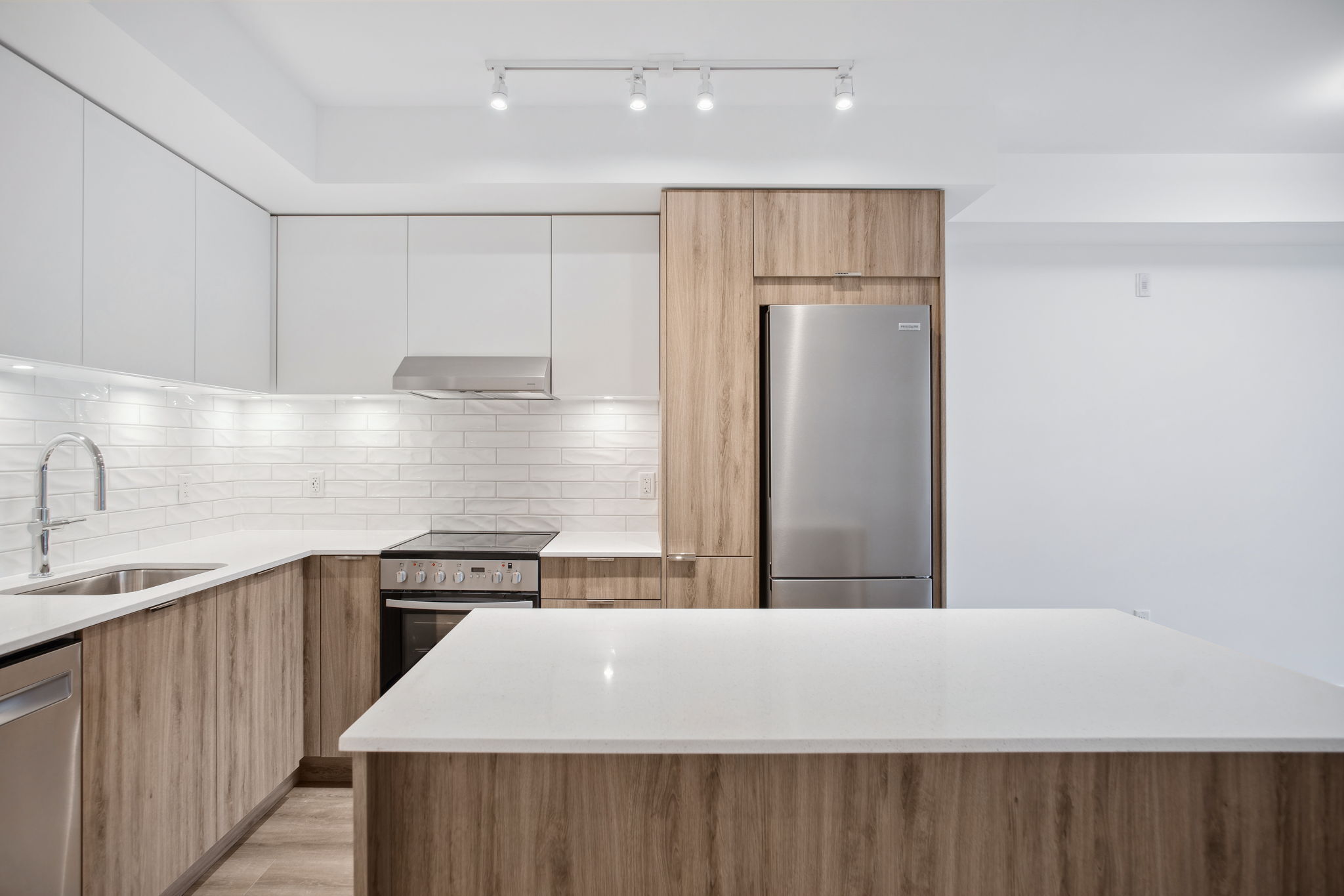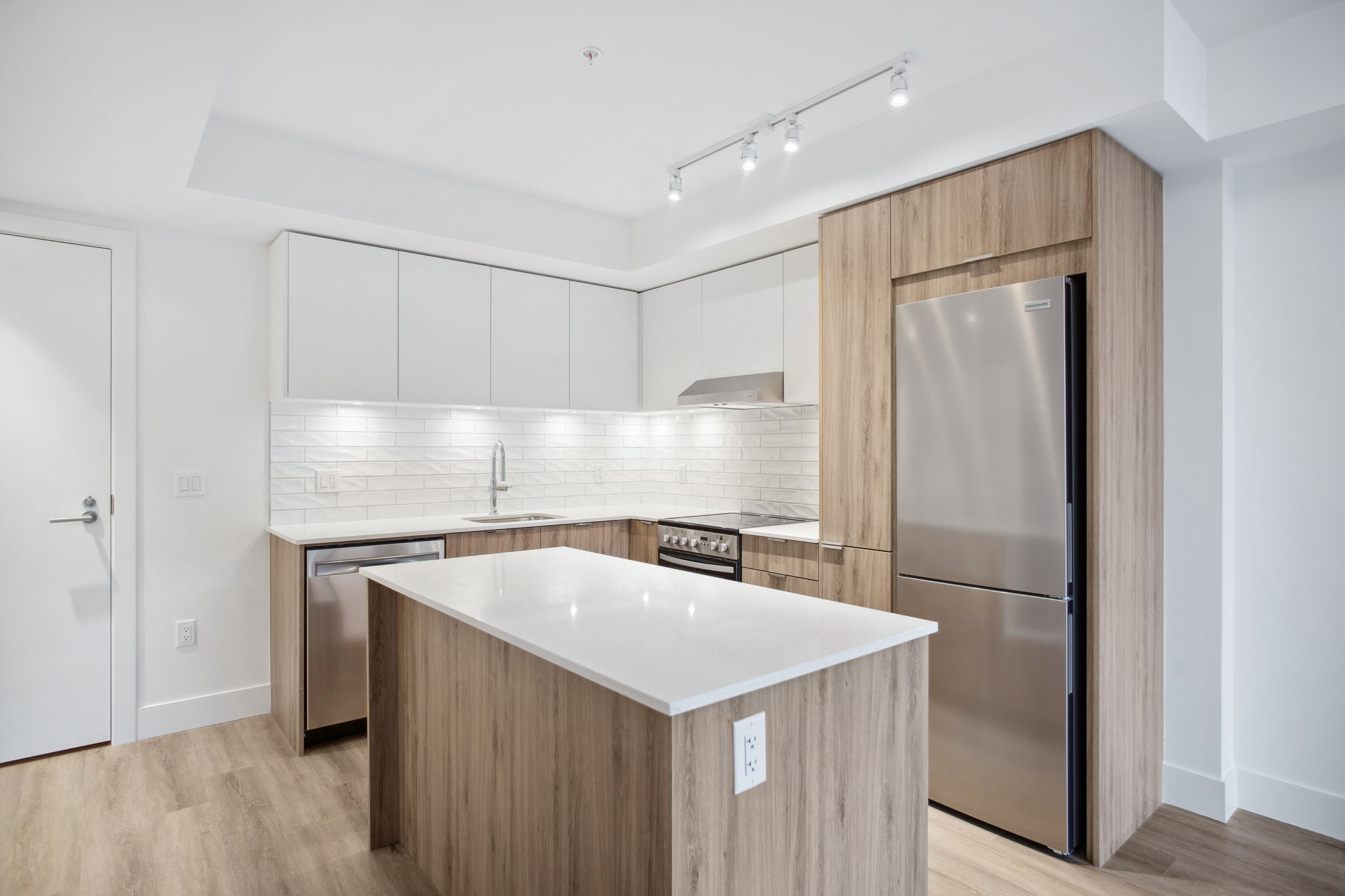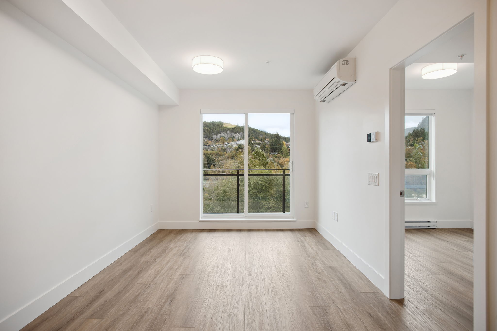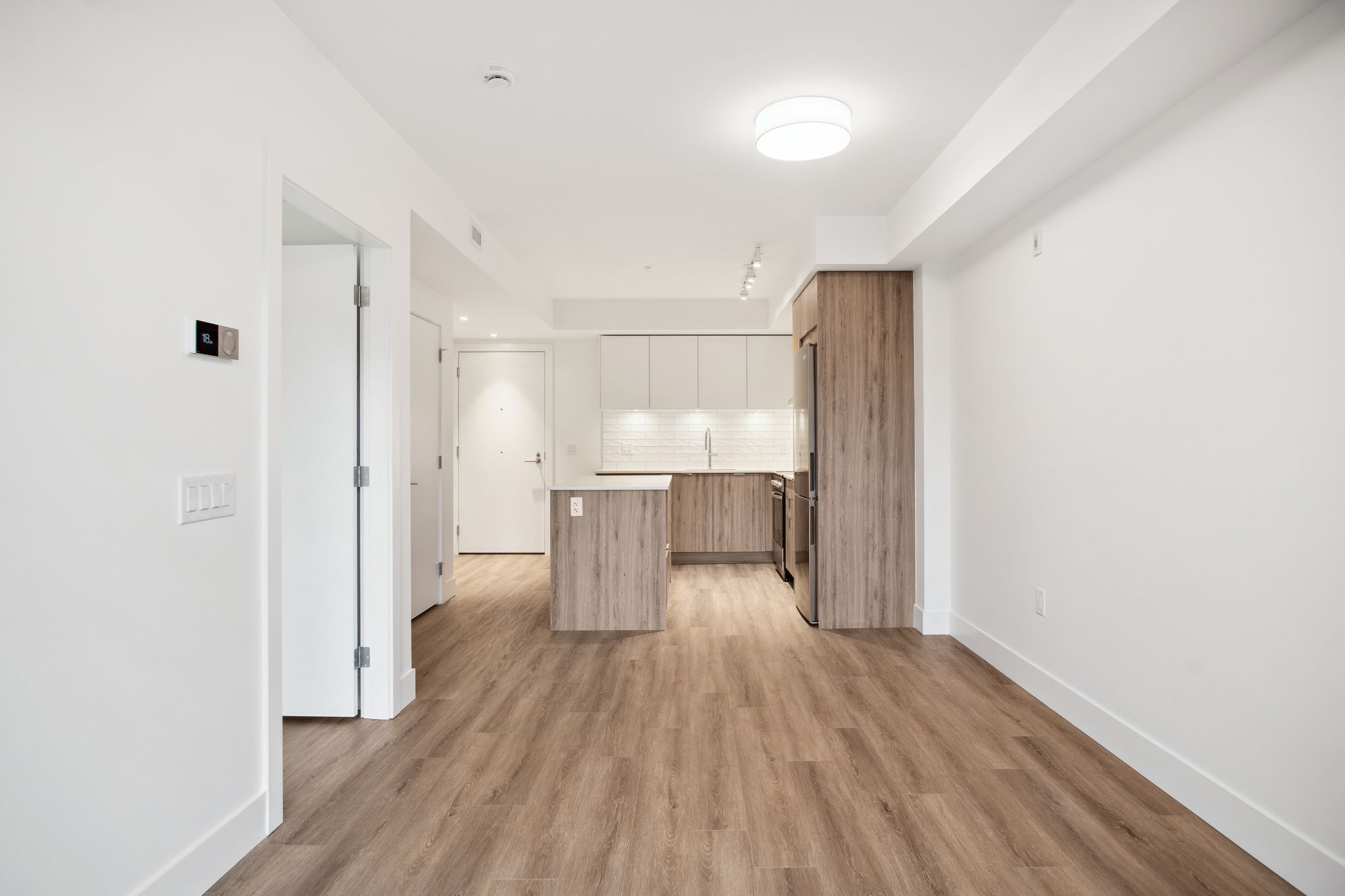 Our B2 layout offers a large corner kitchen with an island offering plenty of countertop and storage space. With natural finishes, the suite is light and airy. An open concept living space allows you to furnish your suite to fit your needs. All suites include mountain views, in-suite laundry, dishwasher and A/C.
