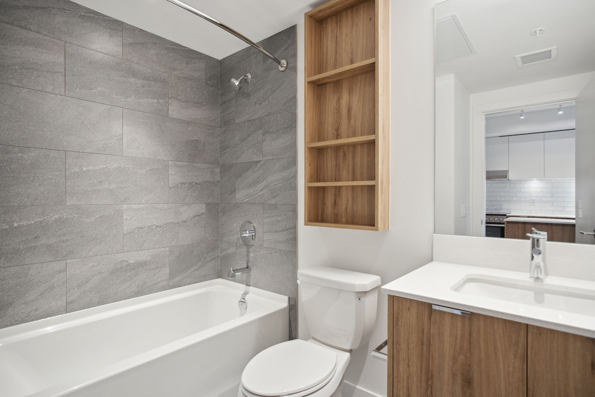 An efficient plan with the added bonus of a flex room for work or storage. The living area extends toward the balcony, where windows capture mountain views. Modern appliances, air conditioning, and in-suite laundry come standard.