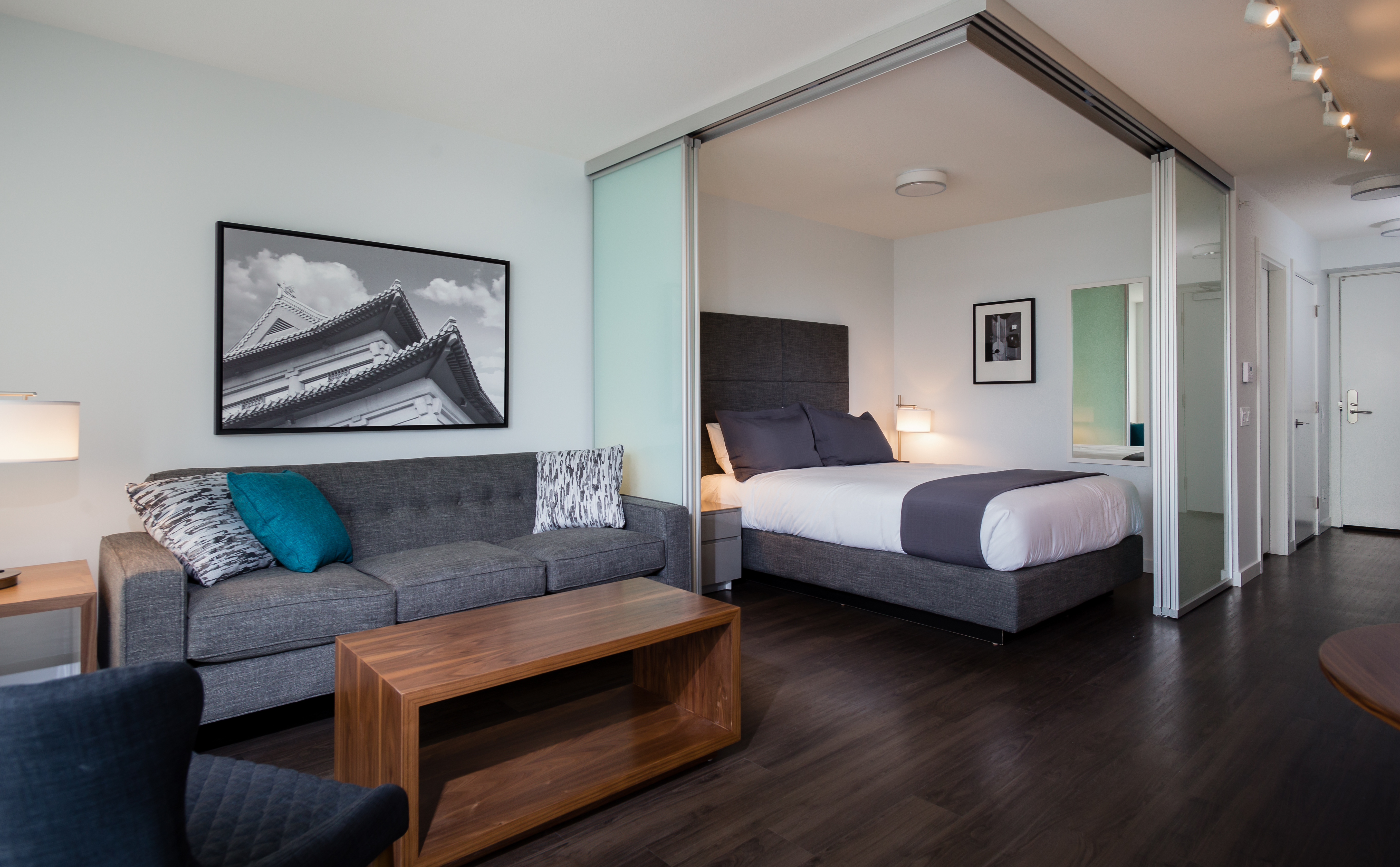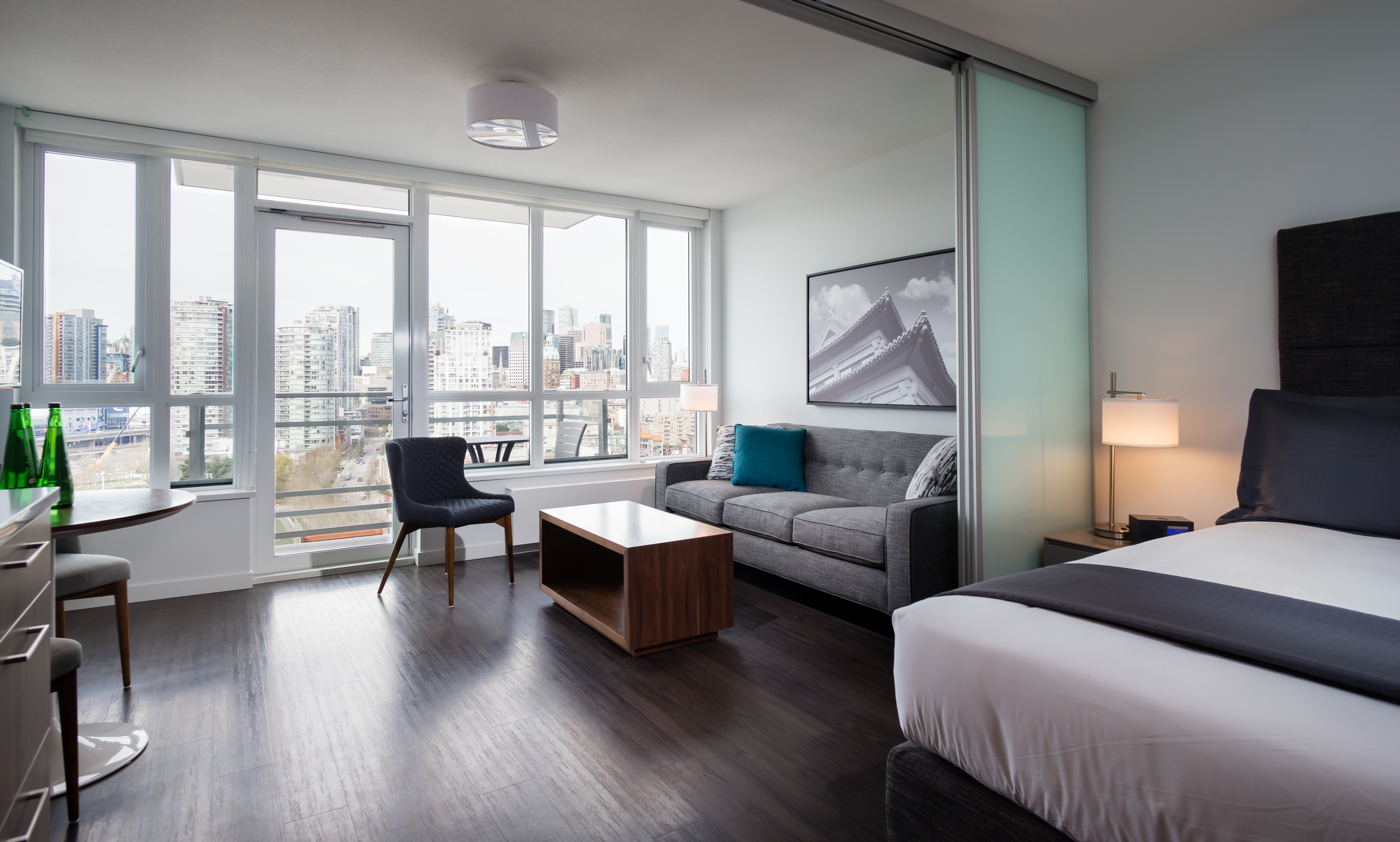 This junior 1BR and flex suite allows maximum flexibility with its separate office and transforming bedroom walls. The suite features modern finishes including: stone countertops, vinyl plank floors and a full appliance package. Relax on the west-facing balcony and take in the unbeatable views of Downtown Vancouver, the mountains, and the ocean.